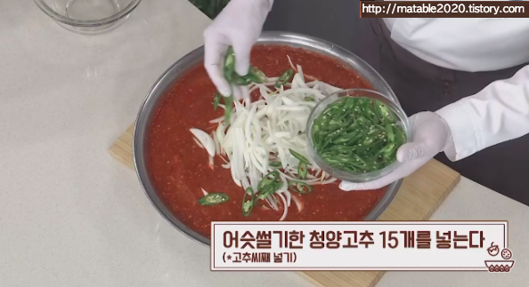 어슷썰기한 청양고추 15개를 넣고 섞는다.